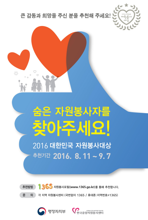 [일간환경연합 장민주 기자]행정자치부는 다음달 7일까지 ‘2016년 대한민국 자원봉사대상’ 후보자 추천을 받는다고 22일 밝혔다.