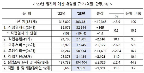 고용노동부는 지난해 12월 23일 국회 본회의에서 의결된 올해 일자리 예산은 전년도 대비 3.9% 감소한 규모로, 24개 부처(청)의 181개 사업을 포함하고 있다고 2일 밝혔다.