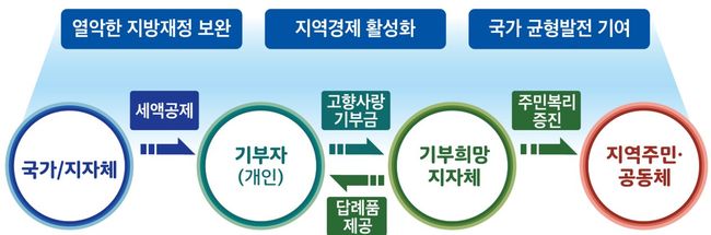 고향사랑기부제는 개인이 태어난 지역은 물론 학업・근무・여행 등을 통해 관계를 맺은 ‘제2의 고향’ 등에 기부하면, 지자체는 기부금을 주민복리증진 등에 사용하고, 기부자에게는 세액공제와 답례품 혜택이 주어지는 제도로 올해 1월 1일부터 시행되었다.