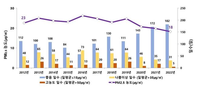 `22년 초미세먼지 `좋음` 일수(일평균 농도 15㎍/㎥ 이하)는 182일로 역대 최다를 기록했으며, `나쁨` 일수(일평균 농도 35㎍/㎥ 초과)는 역대 가장 적은 31일로 나타났다.