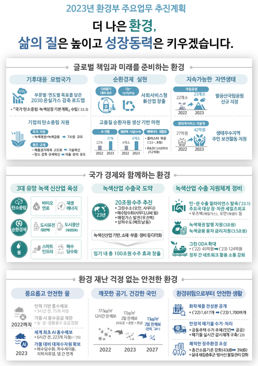 한화진 환경부 장관은 “2023년은 우리나라 최초의 환경법인 ‘공해방지법’이 제정된 지 환갑이 되는 해로서 그동안의 환경정책의 성과를 바탕으로 기후 위기와 각종 재난으로부터 국민의 생명과 안전을 지켜 삶의 질을 높이고, 탄소중립 등 세계질서의 변화 속에서 녹색 신산업을 육성해 성장동력을 높여가겠다”고 밝혔다.