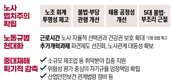 이에 노조 회계공시시스템 구축과 포괄임금 오남용 등 5대 노사부조리 상시감독 및 제도개선 등의 노사 법치주의를 확립해 불법·부당관행을 개선할 방침이다.