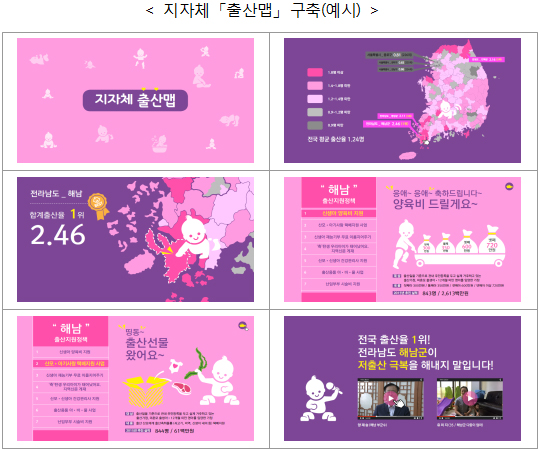 행자부는 “출산맵이 구축되면 지자체별 출산율 순위와 지자체 노력도 등 평가결과도 공개되기 때문에 지자체의 자율경쟁을 적극적으로 유도할 수 있으며 지자체 간의 정책 비교를 통해 벤치마킹도 가능할 것으로 기대된다”고 밝혔다.