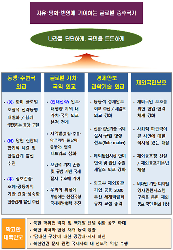 외교부는 국정목표인 ‘자유·평화·번영에 기여하는 글로벌 중추국가 실현’과 국민·국익을 위한 선제적·능동적 외교에 역량을 집중하겠다고 밝혔다.