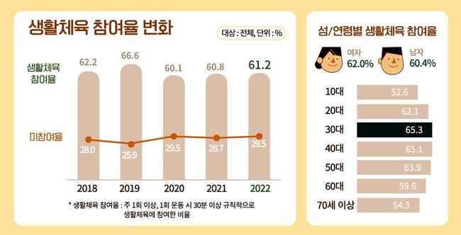 2022년 생활체육 참여율 61.2%, 전년대비 0.4%포인트 상승