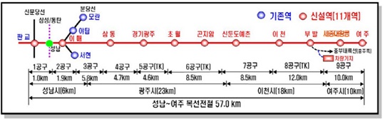 한국철도시설공단(이사장 강영일)이 시행한 본 사업은 성남∼여주간 57km 구간을 복선전철로 건설하는 사업으로서, ’02년 12월 기본계획을 마련한 이후, 총사업비 1조 9,485억원을 투입하여 지난 ’07년 11월 노반공사를 착공한 이래 약 8년 10개월 간에 걸쳐 공사를 시행하여 개통에 이르게 되었으며 본 노선에는 성남시 2개, 광주시 4개, 이천시 3개, 여주시 2개 등 총 11개의 역이 새롭게 만들어 졌으며, 각 지역의 유래와 특성을 반영한 역사 외관 이미지와 타 교통수단과의 연계시설 확충 및 현대화로 각 도시의 랜드마크가 되도록 건축하였다.