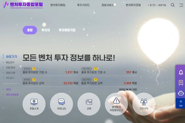 중소벤처기업부와 한국벤처캐피탈협회는 벤처투자와 관련한 다양한 정보 시스템들을 통합‧연계해 한 사이트에서 종합 제공하는 `벤처투자종합포털`을 16일부터 운영한다고 밝혔다.