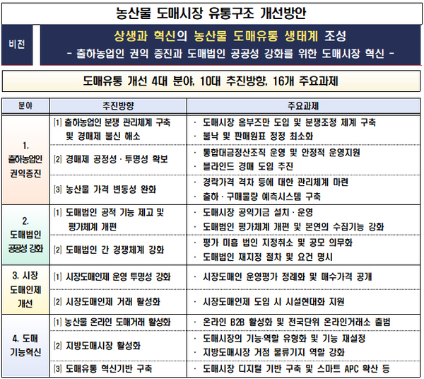 이에 따라 농식품부는 도매유통 구조개선에 대한 농업인과 소비자들의 요구 및 전문가·유통주체 의견수렴 등을 토대로 ▲출하 농업인의 권익증진 ▲도매법인의 공공성 강화 ▲시장도매인제 평가·개선 ▲도매시장 기능혁신 등의 4대 분야를 주요내용으로 하는 ‘농산물 도매시장 유통구조 개선방안’을 마련했다.