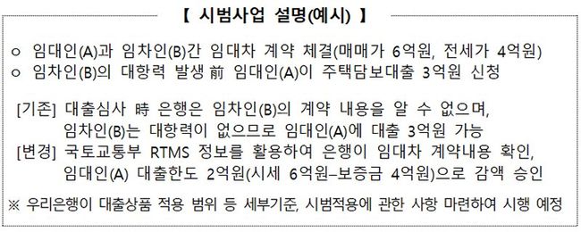 1월 30일부터는 전국 우리은행 710여개 지점에서 주택담보대출 신청인(임대인)의 정보제공 동의를 받아 대출심사 과정에서 담보 대상 주택의 확정일자 정보(보증금, 임대차기간 등)를 확인하여 대출을 실행하는 시범사업을 추진한다.