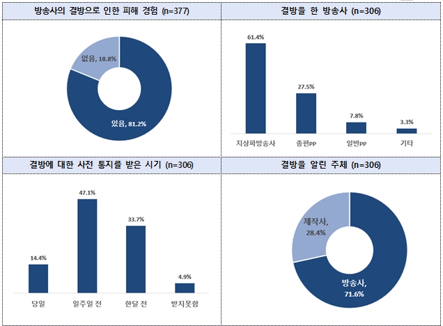 조사 결과를 보면, 결방을 한 방송사는 KBS, MBC, SBS 등 지상파 방송사가 61.4%로 가장 높고 다음은 종합편성채널 사업자(27.5%), 방송채널 사업자(7.8%) 순으로 나타났다. 결방에 대한 사전통지를 받은 기간은 일주일 전(47.1%), 한 달 전(33.7%), 당일(14.4%), 사전통지를 받지 못함(4.9%) 순이었으며, 71.6%는 방송사, 28.4%는 제작사로부터 통지를 받은 것으로 조사됐다.