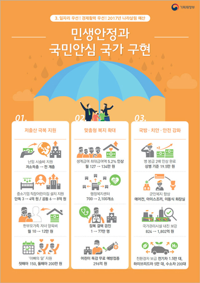 [일간환경연합 장영기 기자]다음은 2017년 예산안 중 민생안정과 국민안심 국가 구현 입니다.인포그래픽 뉴스로 한눈에 확인 할수 있습니다.