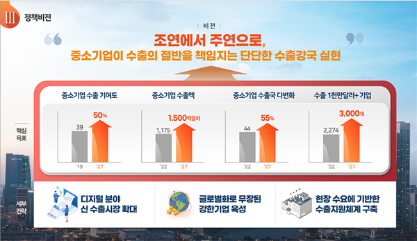 이를 통해 중기부는 지난해 39%(간접수출 포함) 수준인 중소기업의 수출 기여도를 오는 2027년 50%로 끌어올리고 수출액도 1175억달러에서 1500억달러로 높인다는 목표를 세웠다. 수출액 1000만 달러 이상 중소기업도 2027년까지 3000개로 확대할 계획이다.