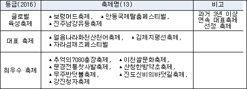 문체부는 그간 ‘문화관광축제’ 선정 제도를 통해 지역축제 중 관광자원으로서 우수한 축제를 발굴해 화천산천어축제와 보령머드축제 등 유명 축제를 육성해 왔다.