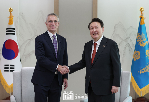 ▲ 윤석열 대통령이 30일 서울 용산 대통령실 청사에서 방한 중인 옌스 스톨텐베르그 북대서양조약기구 사무총장과 악수하고 있다. (사진=대통령실)윤 대통령은 지난해 6월 나토 정상회의 참석을 계기로 빠르게 발전하고 있는 한-나토 관계를 평가한 후, 이러한 발전에 힘입어 지난해 11월 나토 주재 대표부가 개설되었다고 하면서 이를 통해 협력이 더욱 확대되기를 기대한다고 말했다고 김 수석은 전했다.