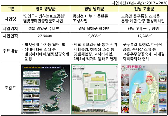 시·도별 선정된 사업 중 일부 사업내용을 보면 경북 영양군 ‘영양국제밤하늘 보호공원 별빛생태관광 명품화사업’은 영양의 생태자원인 청정 밤하늘이라는 독특하고 창의적인 아이템을 활용해 ‘별빛생태’ 다기능 쉘터, ‘별·생태체험관’ 등을 조성하고 여기에 별빛 아카데미, 별빛 캠핑축제 등의 소프트웨어를 융·복합해 지역의 생태자원을 관광화한 사업이다.