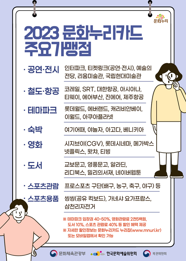 문화누리카드는 전국 2만 7000여 개의 문화예술, 국내 여행, 체육 분야 가맹점에서 이용할 수 있다.