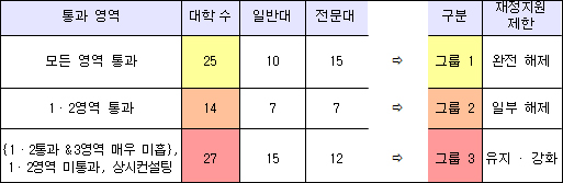 1·2영역을 통과하고 3영역에서 일정 수준의 성과를 보인 14개 대학(그룹2)은 맞춤형 컨설팅 과제를 충실히 이행한 점을 고려해 학생에 대한 국가장학금, 학자금 대출 등 재정지원은 허용하되 정부재정지원사업의 내년도 신규 사업은 지원이 제한된다.