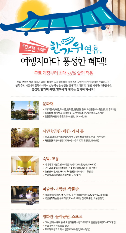 경제적 장벽을 해소하기 위해 민간기업을 포함해 무료 입장 및 할인을 시행하는 것은 물론, 돈이 들지 않아도 즐길 수 있는 한가위 문화관광프로그램도 준비했다.