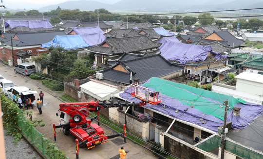 | 경주시 관계자들이 18일 오전 지진피해를 입은 경북 경주시 사정동 주택 기와에 비를 피할 수 있는 천막과 그물을 씌우고 있다. (사진=연합뉴스 제공) |