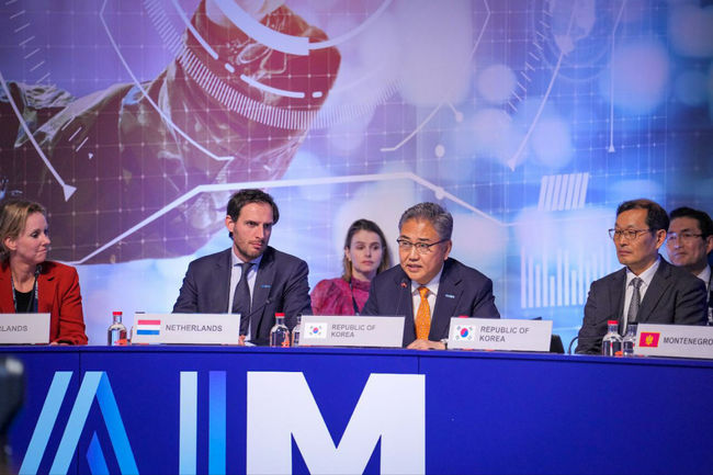 박진 외교장관이 2월 15부터 16일까지 네덜란드 헤이그에서 개최된 `인공지능의 책임 있는 군사적 이용에 관한 고위급회의(이하 `AI 회의`)`에 참석해 발언하고 있다.(사진=외교부 제공)