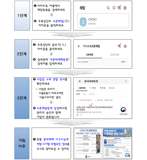 사업주나 산업안전 업무 담당자 누구나 오픈채팅 검색창에 ‘#중대재해동향’을 검색해 입장할 수 있다.