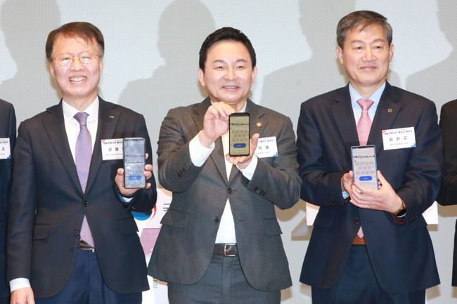 원희룡 국토교통부 장관이 22일 서울 중구 포스트타워 대회의실에서 열린 `알뜰교통카드 플러스 협약식`에서 알뜰교통카드 앱을 보이며 기념촬영을 하고 있다. (왼쪽부터) 권용복 한국교통안전공단 이사장, 원 장관, 정완규 여신금융협회 회장.