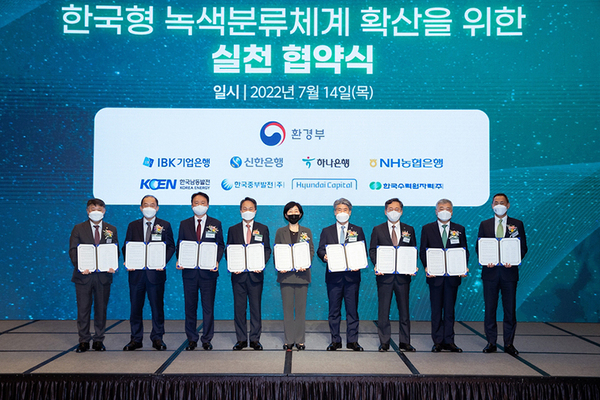 ▲ 한화진 환경부장관이 지난해 7월 서울시 중구 소재 밀레니엄 힐튼호텔에서 열린 ‘녹색분류체계 확산을 위한 실천 협약식’에 참석해 협약서에 서명한 후 협약 금융사 및 기업 대표들과 함께 기념촬영을 하고 있다.(사진=환경부)한국형 녹색채권은 발행자금이 한국형 녹색분류체계에 의해 정의된 녹색경제활동에 사용되는 채권이다. ‘한국형 녹색채권 지침서(가이드라인)’를 준수해서 발행해야 한다.
