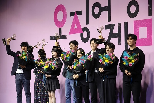 ▲ 지난해 9월 16일 오후 서울 중구 웨스틴조선호텔에서 열린 넷플릭스 시리즈 ‘오징어게임’ 에미상 수상 기념 간담회에서 황동혁 감독을 비롯한 배우와 스태프가 포즈를 취하고 있다. 오징어게임은 74회 에미상 드라마 부문에서 황동혁 감독이 감독상을, 배우 이정재가 남우주연상을 받는 등 6관왕을 차지했다.(사진=문화체육관광부 국민소통실)문체부는 2027년까지 K-콘텐츠 수출 250억달러, 세계 4대 콘텐츠 강국 실현이라는 목표를 세웠다.