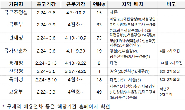 3월에는 행정안전부·문화체육관광부 등 22개 기관, 4월에는 중소벤처기업부·농림축산식품부 등 8개 기관이 순차적으로 청년인턴 채용 절차를 진행할 예정이다.