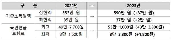 보건복지부는 3일 ‘2023년 제2차 국민연금심의위원회’를 개최해 상한액은 553만 원에서 590만 원으로, 하한액은 35만 원에서 37만 원으로 조정 예정이라고 밝혔다.