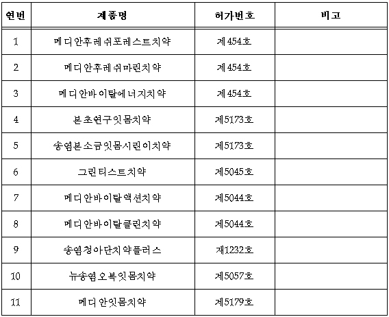 [일간환경연합 신상미 기자]식품의약품안전처는 의약외품인 치약제에 허용되지 않은 원료 ‘CMIT/MIT(메칠클로로이소치아졸리논/메칠이소치아졸리논)’가 함유된 것으로 확인된 치약 11종을 회수한다고 밝혔다.