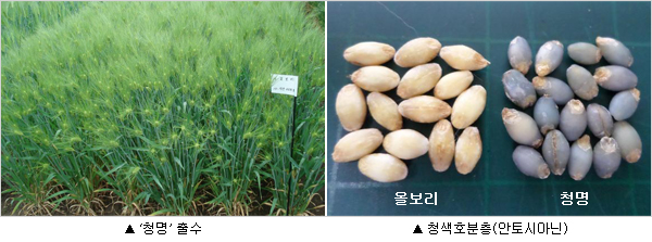 이번에 개발한 '청명'의 안토시아닌 함량은 g당 350㎍으로 비교품종인 '올보리'보다 3배 이상 높다.또한 폴리페놀 함량도 6.8% 정도 많아 보리차 등 가공용으로 적합하다.