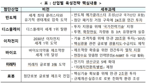 국내 기업들은 2026년까지 반도체, 디스플레이, 이차전지, 바이오, 미래차, 로봇 등 우리가 강점을 보유한 첨단 분야 6대 핵심 산업에 550조원을 투자한다. 정부도 투자, 인력, 기술, 생태계 등 종합적인 육성 전략을 통해 글로벌 선도국 도약을 적극 지원한다.