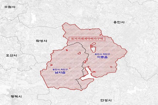 구체적으로 남사읍(58.46㎢)과 이동읍(71.02㎢) 내의 주거지역과 용도 미지정 구역은 60㎡, 상업지역과 공업지역은 150㎡, 녹지지역은 100㎡를 초과할 경우 토지거래 허가를 받아야 한다.