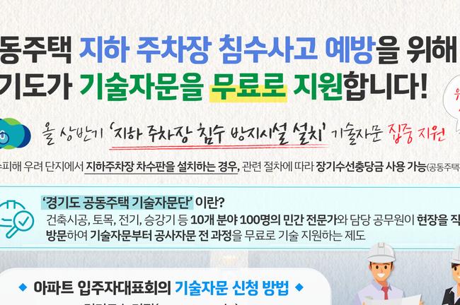 [일간환경연합 한선미 기자] 경기도가 공동주택에서 지하 주차장 내 침수 방지시설을 원활히 설치할 수 있도록 ‘경기도 공동주택 기술자문단’이 전문적인 기술지원을 무료로 지원한다며, 신청을 독려했다.