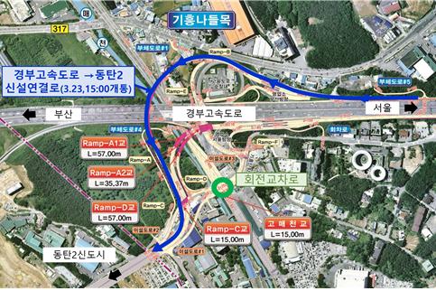 한국도로공사가 경부고속도로 기흥나들목 개량공사의 일환으로 경부고속도로 하행선 기흥나들목에서 화성시 동탄2신도시 방면으로 바로 향하는 진출로를 개설하고, 23일 15시부터 임시 개통한다.