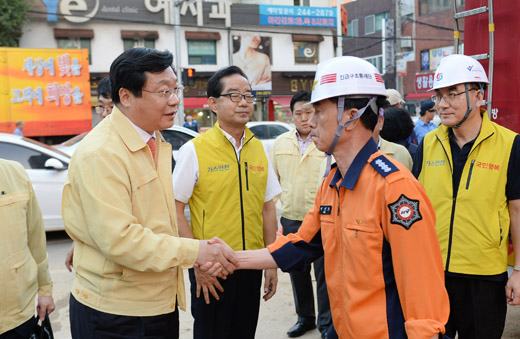 주 장관은 울산·경남지역의 태풍 피해가 심한 태화시장과 우정시장 피해 현장의 복구현황을 살펴보고 태풍으로 침수, 정전 등의 피해를 입은 지역 주민들에게 위로의 말을 전달했다.