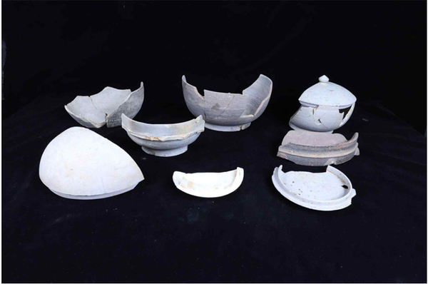▲ 석축 저온저장고 출토 토기.특히 1호 시설에서 출토된 뚜껑과 2호 시설에서 나온 대부완은 한 벌을 이루고 있고 1호와 2호에서 출토된 호형 토기편은 서로 접합되는 것으로 파악됐다.
