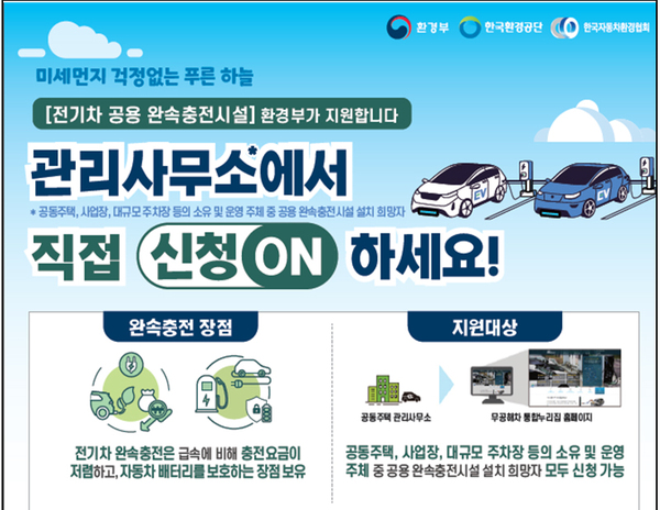 환경부는 지난 1월 2일부터 무공해차 통합누리집을 통해 공동주택·사업장·주차장(대규모) 소유·운영 주체로부터 직접 전기차 공용 완속충전기 설치 신청을 받고 있다. 기존에는 민간 충전사업자만 충전기 설치를 신청할 수 있었다.
