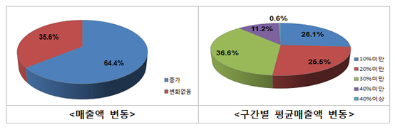 중소기업청은 12일 최근 코리아세일페스타 참여 50개 시장 상인 250명을 대상으로 설문조사한 결과 64.4%가 행사가 시작된 지난달 29일부터 11일동안 매출액이 지난해 같은 기간 보다 늘었다고 응답했다.