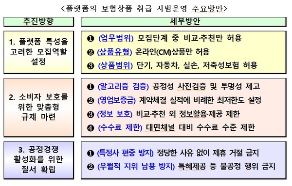 이는 지난해 8월 23일 제2차 금융규제혁신회의 이후 발표한 ‘플랫폼의 보험상품 취급 시범운영방안’의 후속 조치로 이해관계자 의견수렴, 제7차 금융규제혁신회의를 거쳐 내용을 확정했다.