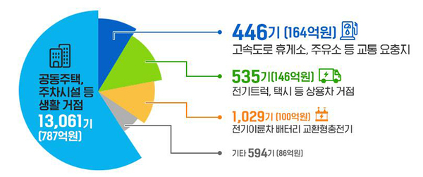 사업 유형별로는 ▲공동주택, 주차시설 등 생활거점에 1만 3002기(783억 원) ▲전기화물차, 택시 등 상용차 거점에 535기(146억 원) ▲고속도로 휴게소, 주유소 등 교통 요충지에 446기(164억 원) ▲전기이륜차 배터리교환형충전기 1029기(100억 원) 등이다.