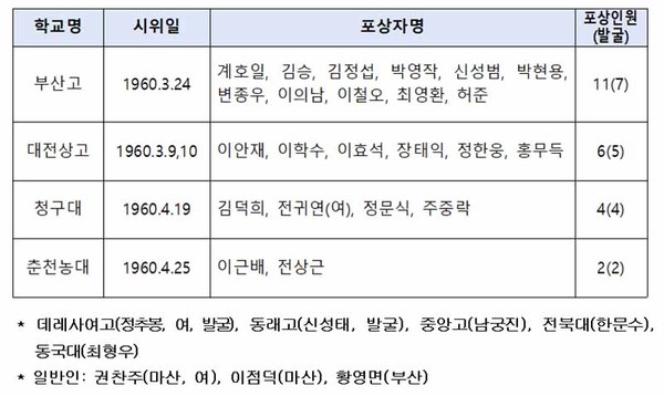 학교별로 살펴보면 부산고 11명, 대전상고 6명, 대구 청구대 4명, 춘천농대 2명 등이다. 전체 포상자 가운데 생존자는 17명, 여성은 3명이다.