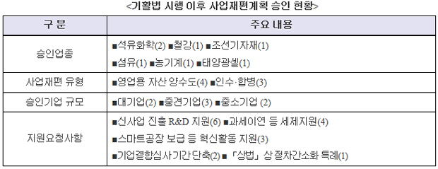 이날 승인은 지난 9월 3건의 승인에 이은 두 번째로, 기활법 사업재편계획 승인기업은 총 6개 업종 7개 기업으로 늘어났다.
