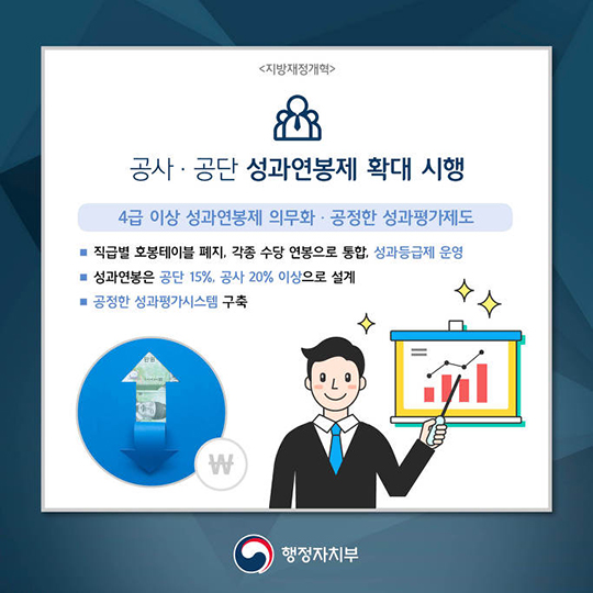 이어 특히 공공기관은 4대부문 개혁을 선도하며 부채감축, 방만경영 개선, 임금피크제 도입, 성과연봉제 확대 등 적지 않은 개혁성과를 이뤘다 면서 그간의 성과가 우리사회에 확고히 뿌리내릴 수 있도록 공공기관 개혁 노력을 지속해줄 것 을 당부했다.