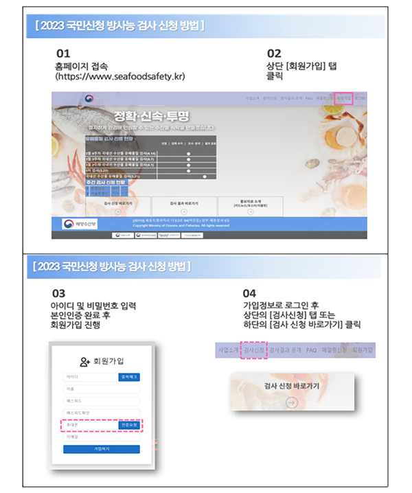 국민 누구나 방사능 검사 게시판(seafoodsafety.kr)에서 회원가입을 한 후 품목과 지역을 선택해 주 1회 신청할 수 있다. 신청현황은 투명하게 공개된다.