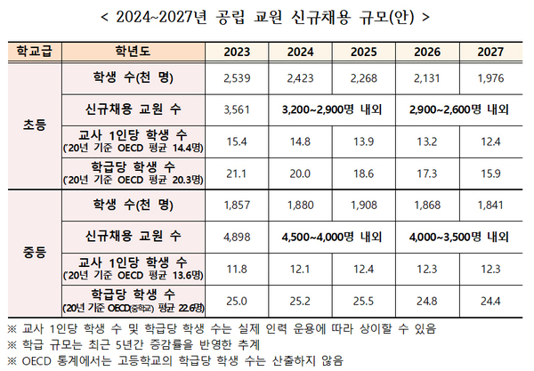학령인구 감소 추세 및 새로운 교육 수요를 반영한 중장기 교원수급계획에 따라 교육부는 내년 교사 신규채용의 경우 초등 3200명 안팎, 중등 4500명 내외로 선발할 예정이다.
