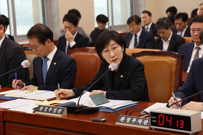 환경부 한화진 장관이 국회에서 열린 환경노동위원회 전체회의에 참석했다.