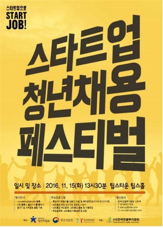 [일간환경연합 한선미 기자]대통령직속 청년위원회와 중소기업청이 내달 15일 서울 역삼동 팁스타운 지하 1층 팁스홀에서 청년 취업난과 스타트업 인력난을 해소하기 위한 ‘스타트업 청년채용 페스티벌’을 개최한다.