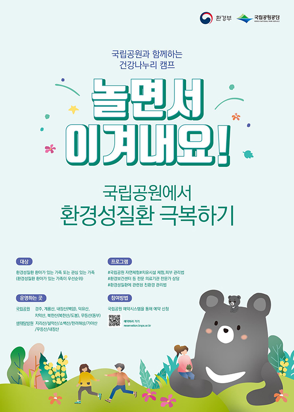 [일간환경연합 장민주 기자]환경부와 국립공원공단은 아토피 피부염 등 환경성질환을 앓고 있는 어린이와 가족이 참여하는 ‘국립공원 건강나누리 캠프’를 운영한다고 7일 밝혔다.